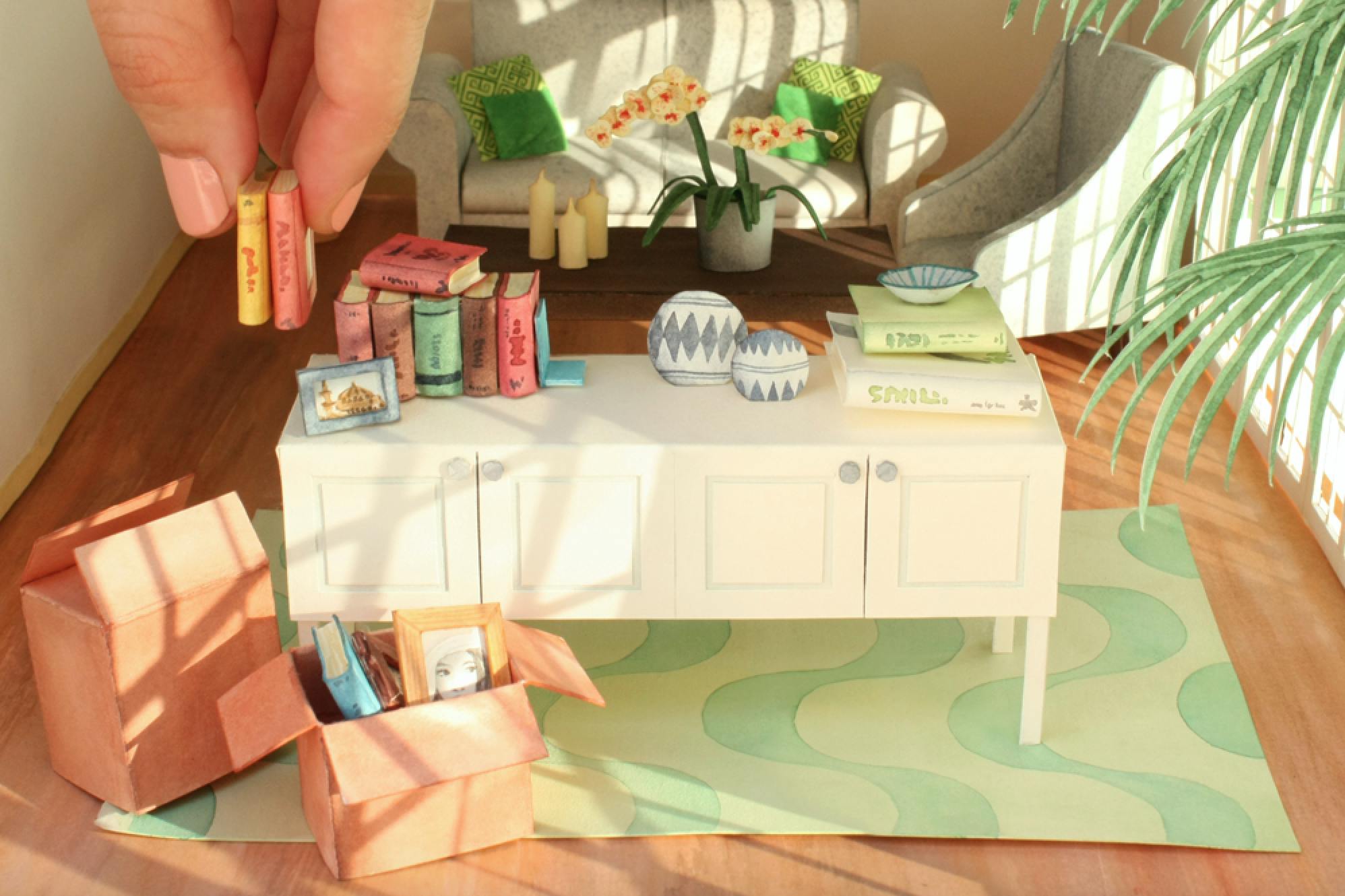 When I was illustrating my first children’s book suddenly 2D wasn’t enough for me… So I started cutting paper and creating a little house in 3D for the main characters of the book and I got hooked on cutting and miniatures! I didn’t have many frames of reference of miniatures or illustrators, but an exhibition of paper theaters I had seen some time ago was still popping in my head.